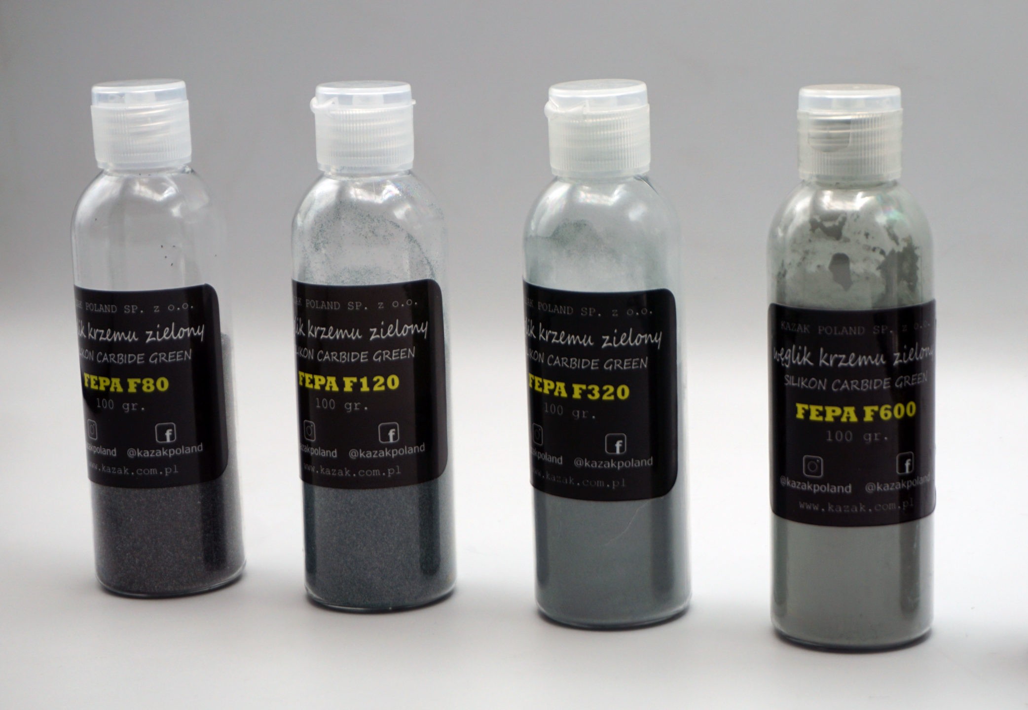 Silicon carbide powder of grain sizes : FEPA F80(180 µm), FEPA F120 (105 µm), FEPA F320 (29 µm), FEPA F600 (9 µm). Designed for leveling stones. The quantity is 5 x 100 grams.